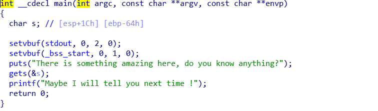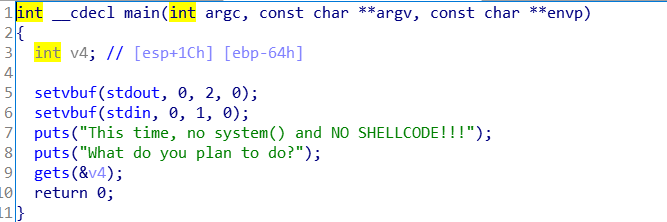 系统调用(简要介绍) 系统调用:运行在用户空间的程序向操作系统内核请求需要更高权限运行的服务。系统调用提供用户程序与操作系统之间的接口。大多数系统交互式操作需求在内核态运行。 整个过程如下:首先指令流执行到系统调用函数时,系统调用函数通过int 0x80指令进入系统调用入口程序,并且把系统调用号放入%eax中,如果需要传递参数,则把参数放入%ebx,%ecx和%edx中。进入系统调用入口程序(System_call)后,它首先把相关的寄存器压入内核堆栈(以备将来恢复),这个过程称为保护现场。保护现场的工作完成后,开始检查系统调用号是不是一个有效值,如果不是则退出。接下来根据系统调用号开始调用系统调用处理程序(这是一个正式执行系统调用功能的函数),从系统调用处理程序返回后,就会去检查当前进程是否处于就绪态、进程时间片是否用完,如果不在就绪态或者时间片已用完,那么就会去调用进程调度程序schedule(),转去执行其他进程。如果不执行进程调度程序,那么接下来就会开始执行ret_from_sys_call,顾名思义,这这个程序主要执行一些系统调用的后处理工作。比如它会去检查当前进程是否有需要处理的信号,如果有则去调用do_signal(),然后进行一些恢复现场的工作,返回到原先的进程指令流中。至此整个系统调用的过程就结束了。 回到这题,同样的它开启了NX保护,进入ida中查看反汇编; 正如上面的反汇编代码所说,这题无system函数,也无法使用shellcode,这时候我们考虑系统调用。系统函数调用的指令是int 0x80,这是固定指令,他有四个参数:
