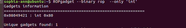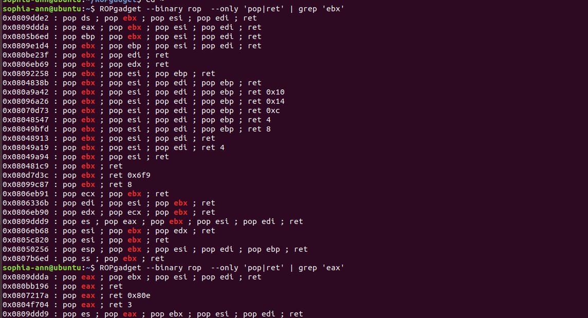 接下来我们就要一点点的去拼凑这些内容,我们没法直接在栈里写指令,只能够利用程序中自带的指令去拼凑。 首先我们将eax设置为0xb,我们是没法直接往栈里写mov eax,0xb的,那么还有另一种方式是pop eax,但是要保证栈顶必须是0xb。 然后设置ebx,ecx,edx,同样是这样的道理,所以我们可以想象栈中的数据是: pop eax;ret 0xb pop ebx;pop ecx;pop edx;ret “/bin/sh”的地址 0 0 int 0x80的地址 接下来我们就要找pop eax,pop ebx,pop ecx,pop edx的指令,这需要用到ROPgadget(我才知道有这个,装了好久才弄好,呜呜呜呜呜呜呜) –only是指只有pop和ret指令 接下来找’/bin/sh’字符 找int 0x80地址 最后写exp: