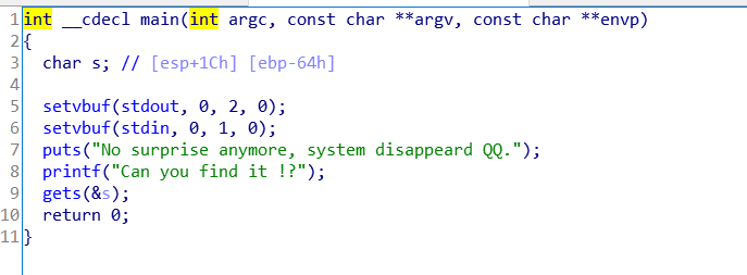 0x05 ret2libc3 这道题还是开启了NX保护,打开ida,情况如下: 这次secure上无system函数,搜索也没有’/bin/sh’。所以本题我们要利用libc泄露。 大致思路 泄露 __libc_start_main 地址 获取 libc 版本 获取 system 地址与 /bin/sh 的地址 再次执行源程序 触发栈溢出执行 system(‘/bin/sh’)exp: