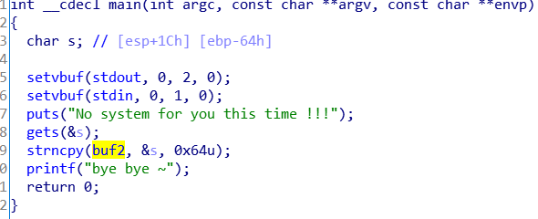 0x04 ret2libc2 这道题稍微有点意思。同样的开了NX保护,看ida结果 这次给了system函数,但没给’/bin/sh’,要我们自己填充。可读写的bss段上有buf2 之后找到了ebx,写exp;