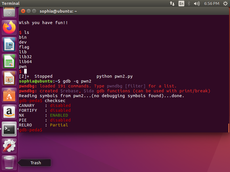 这道题先在虚拟机中用gdb pwn2打开直接输入checksec,查看它的保护机制